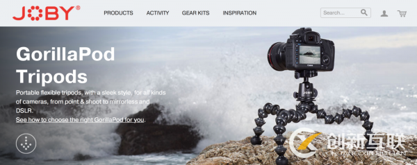 根據(jù)環(huán)境和使用場(chǎng)景來(lái)展示產(chǎn)品是電商網(wǎng)站常用的機(jī)巧。而實(shí)際的數(shù)據(jù)也表明,這樣的圖片擁有著極高的轉(zhuǎn)化率。舉個(gè)例子,下面所展示的 GorillaPod 就將產(chǎn)品置于實(shí)際的使用場(chǎng)景中,給予用戶(hù)真實(shí)的使用體驗(yàn)。靈活的三腳架在整個(gè)圖片中作為焦點(diǎn)而存在整個(gè)首圖的設(shè)計(jì)富有創(chuàng)造性,信息和內(nèi)容的傳遞也頗為高效。