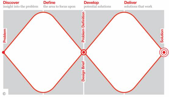 雙鉆設計模型把設計過程分成4個階段:發現問題、定義問題、構思方案和交付方案。