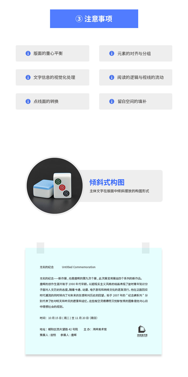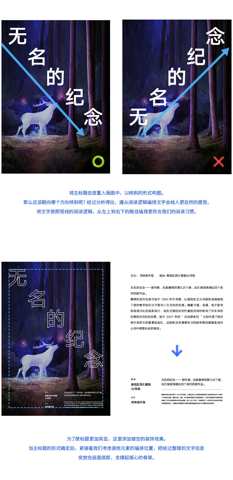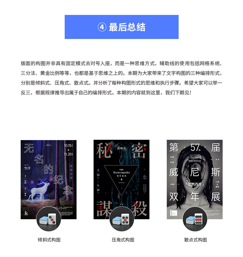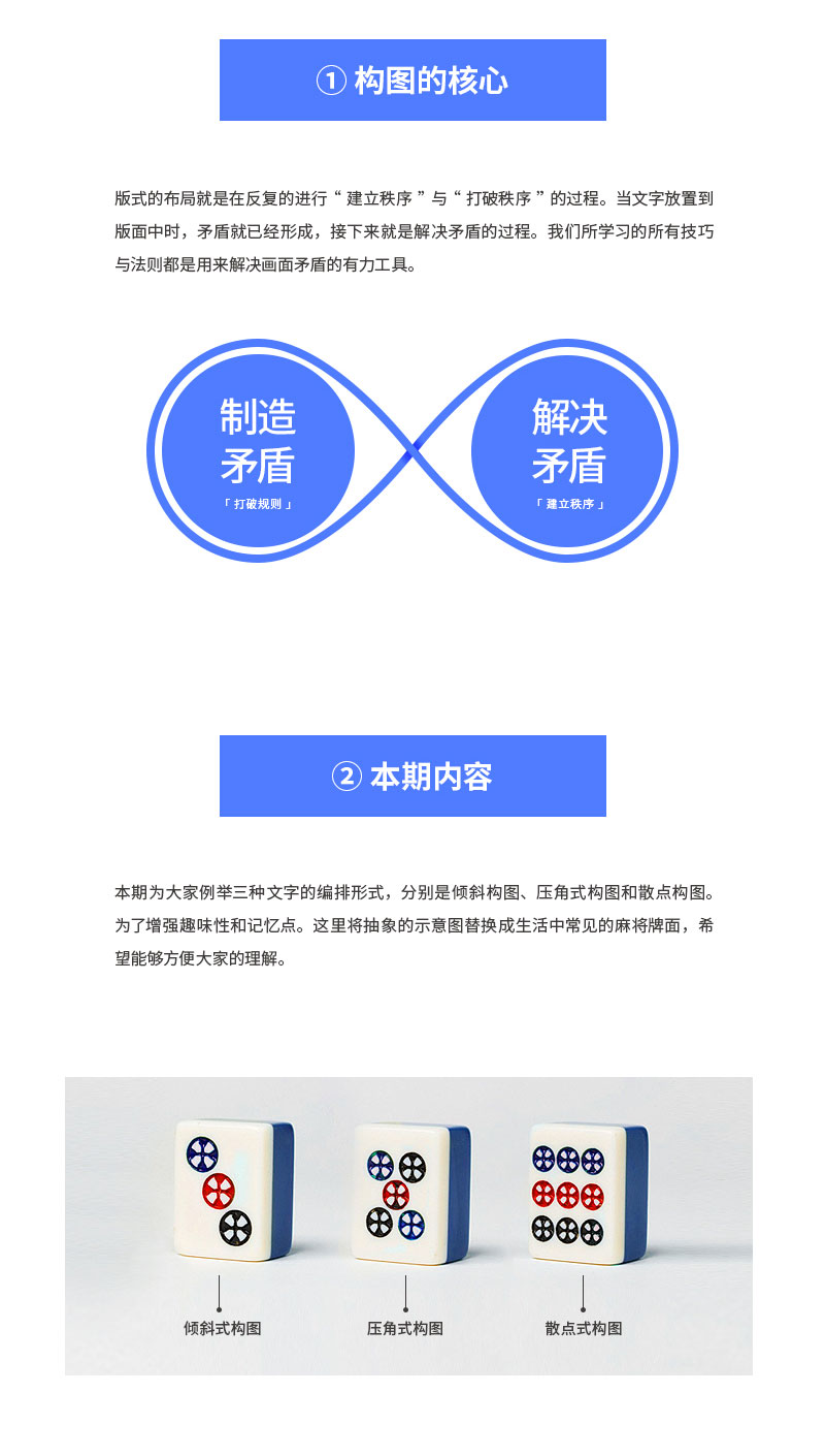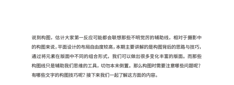說到構圖,估計大家第一反應可能都會聯想那些不明覺厲的輔助線,相對于攝影中的構圖來說,平面設計的布局自由度較高,本期主要講解的是構圖背后的思路與技巧,通過將元素在版面中不同的組合形式,我們可以做出很多變化豐富的版面。而那些構圖線只是輔助我們思維的工具,切勿本末倒置。那么構圖時需要注意哪些問題呢?有哪些文字的構圖技巧呢?接下來我們一起了解這方面的內容。