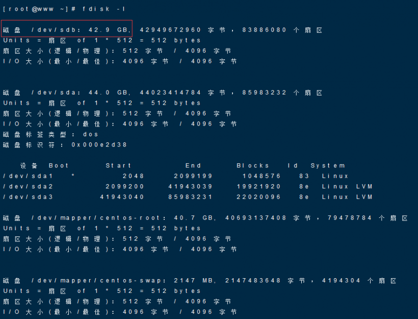 1.通過SSH連接到CentOS服務器,fdisk -l命令查看磁盤使用情況,此處查看到42.9GB的磁盤/dev/sdb未分區掛載,我們就用這個磁盤進行分區掛載示范。