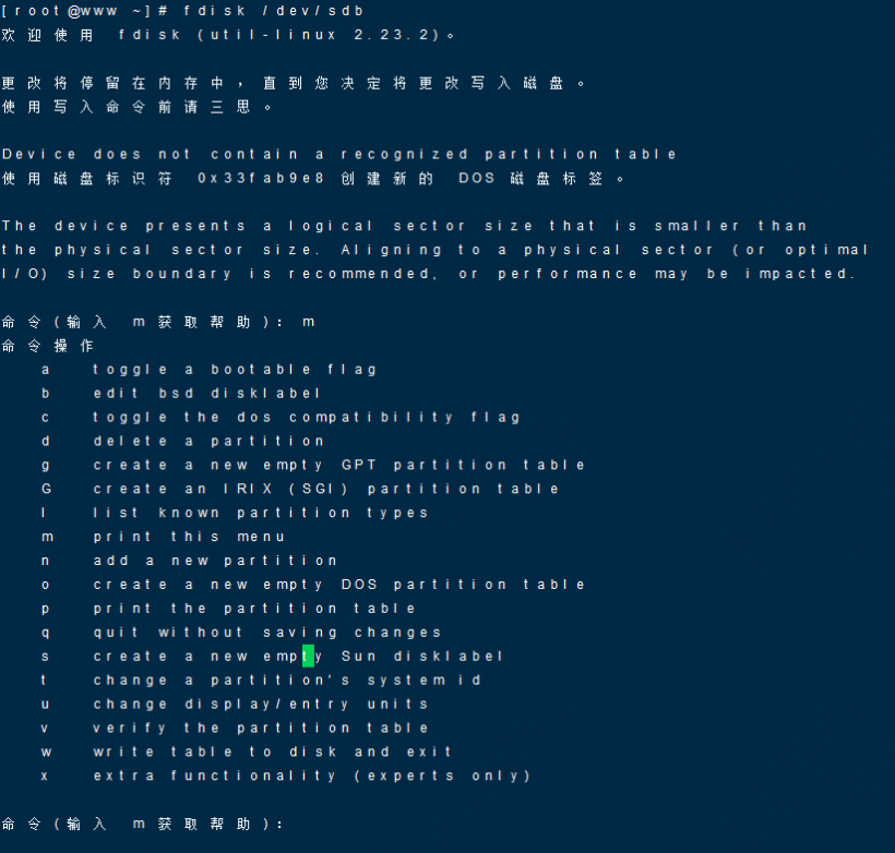 3.我們對磁盤/dev/sdb進行分區操作,輸入命令fdisk /dev/sdb開始分區,可輸入m獲取命令幫助。