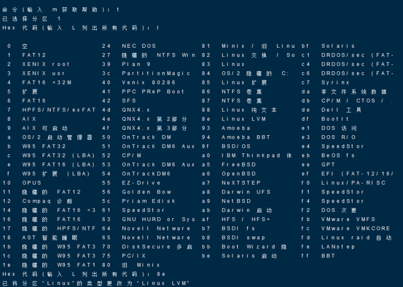 輸入t設置分區的類型,可輸入L獲取所有分區類型的代碼,這里我使用8eLVM分區類型。