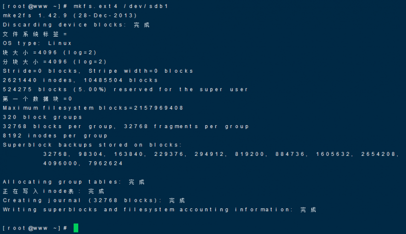 4.接下來我們進行分區的格式化并且掛載到目錄。輸入mkfs.ext4 /dev/sdb1格式化分區,這里的/dev/sdb1就是我們剛剛分配好的分區。可再次用fdisk -l命令查看磁盤分區的情況。