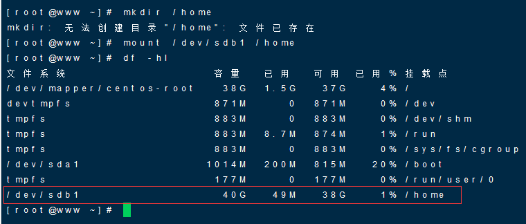 命令mount /dev/sdb1 /home,掛載/dev/sdb1分區到/home目錄,掛載成功后可用df -hl命令查看掛載的分區以及目錄,這里查看到成功掛載。