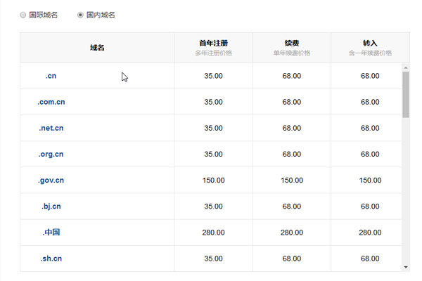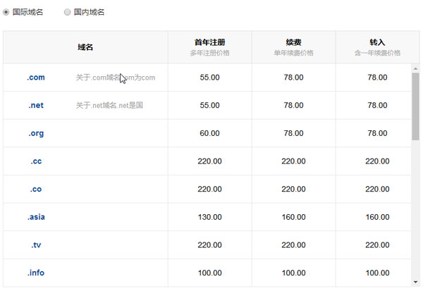 域名。域名注冊費用相對便宜很多,一般建議用戶注冊.com,.net或者.cn這些英文域名。域名空間到達租用期限如果繼續使用是需續費的。價格為:
