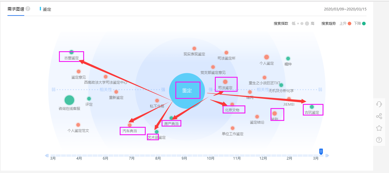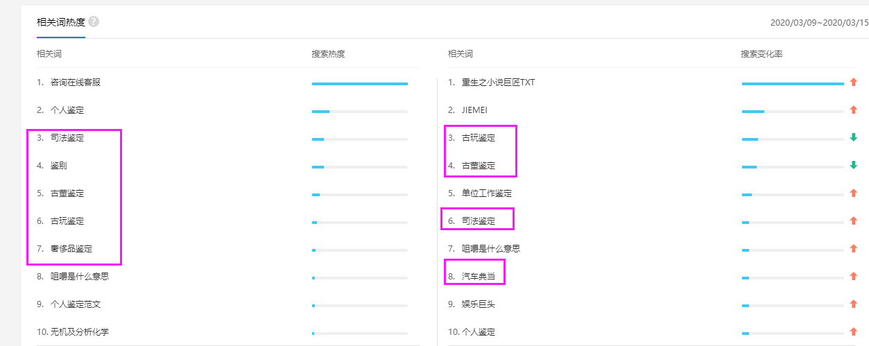 從相關詞熱度可以看出,司法鑒定、鑒別、古董鑒定、古玩鑒定、奢侈品鑒定、汽車典當的搜索熱度相對較高。