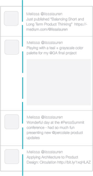 一個這樣的例子在產品設計的時間表在Twitter應用。在這個設計中,垂直軸幫助定義一個部分頭像左邊和右邊部分為微博內容。