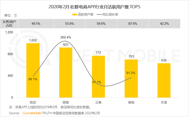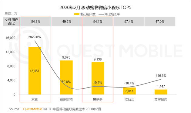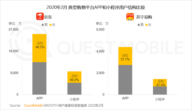 6.3 以男性用戶為主的京東、蘇寧易購通過拼購、社交裂變等玩法,吸引了較多女性,其微信小程序女性用戶占比均高于App。