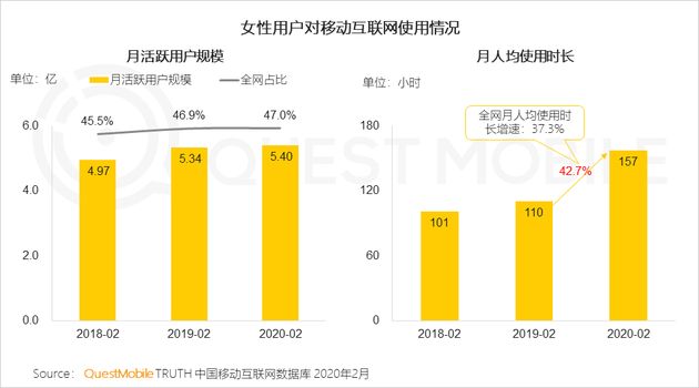 女性占據互聯網半壁江山,對于電商、視頻等行業的使用增加尤為突出