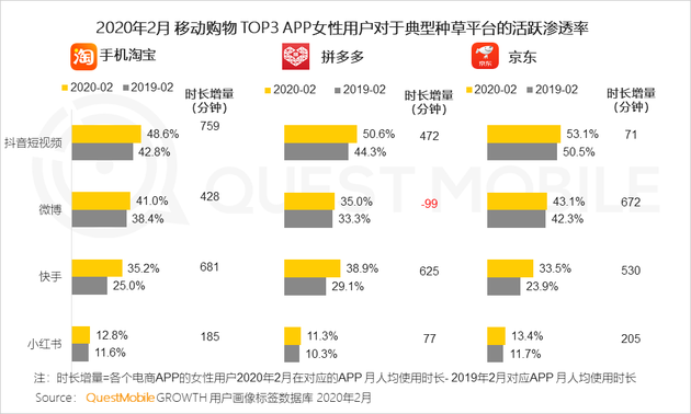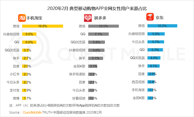 5、微信好友推薦,或者在抖音、快手、小紅書中被種草,再去電商商城平臺下單購買,成為很多女性典型購物模式,手機淘寶、拼多多、京東的女性用戶中,來源于社交、短視頻等平臺的比例非常高。