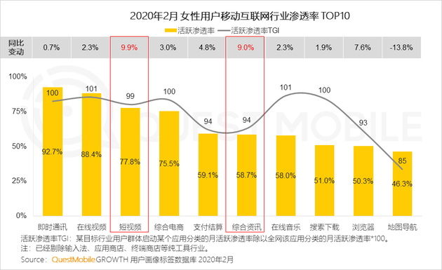 3、女性用戶對于多數行業滲透率均增加,與全網用戶一樣,女性對短視頻的增長最突出,疫情以來,女性對于信息需求非常緊迫,對綜合資訊、瀏覽器等應用人數增加明顯。