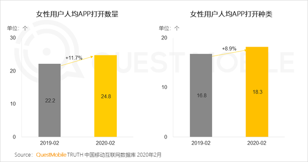 2、女性用戶對移動互聯網的使用更加豐富和深入,打開的App數量、種類都在增加。