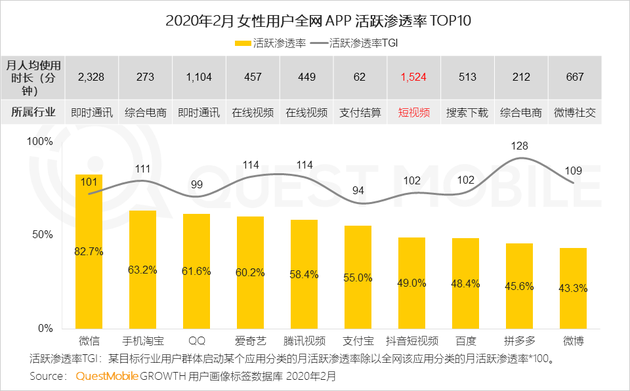5、女性用戶最常用的App集中在社交、視頻、電商領域,其中,女性對于短視頻的興趣非常突出,用于刷抖音的時長僅次于微信。