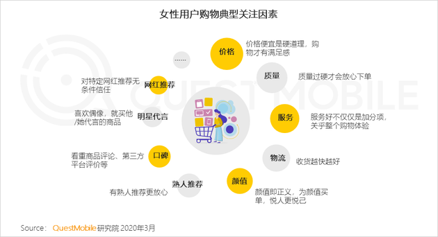 3、女性購物時,考慮的因素越來越多,除了價格、品質等傳統購物因素,社交推薦、顏值、明星代言、網紅推薦都可能成為女性下單的理由。