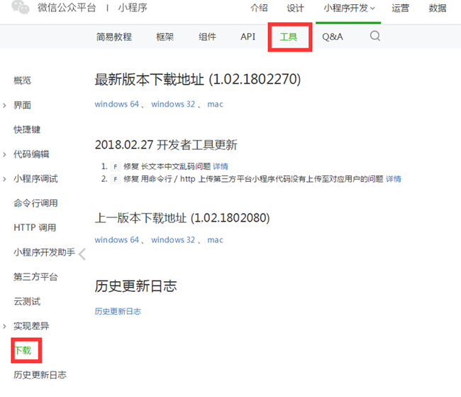 創新互聯小編了解,最近微信公眾平臺的小程序已經出現了最新版本的開發工具,可以看到以下不同版本的系統更新下載 Windows 32 位、Windows 64 位和 Mac 這三個版本。可根據實際情況,選擇適合最新小程序開發工具來給自己開發。小程序開發工具最新版本下載地址是:https://mp.weixin.qq.com/debug/wxadoc/dev/devtools/download.html