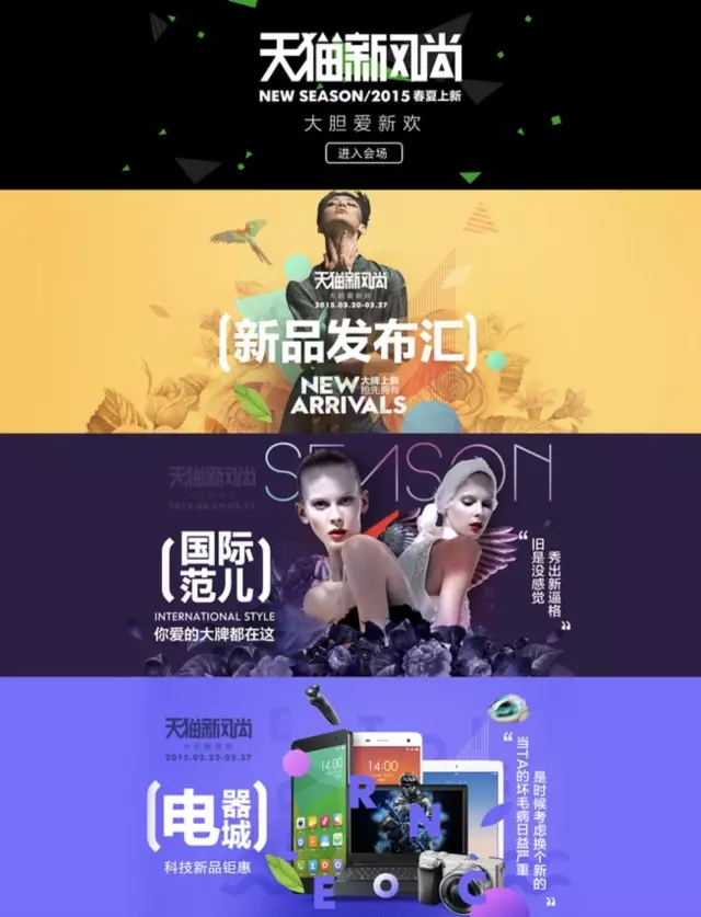 2015年天貓新風尚好像也是首次加入了一些實物在頁面里,當時覺得還蠻有新意的,因為以前基本只是玩圖形元素而已。