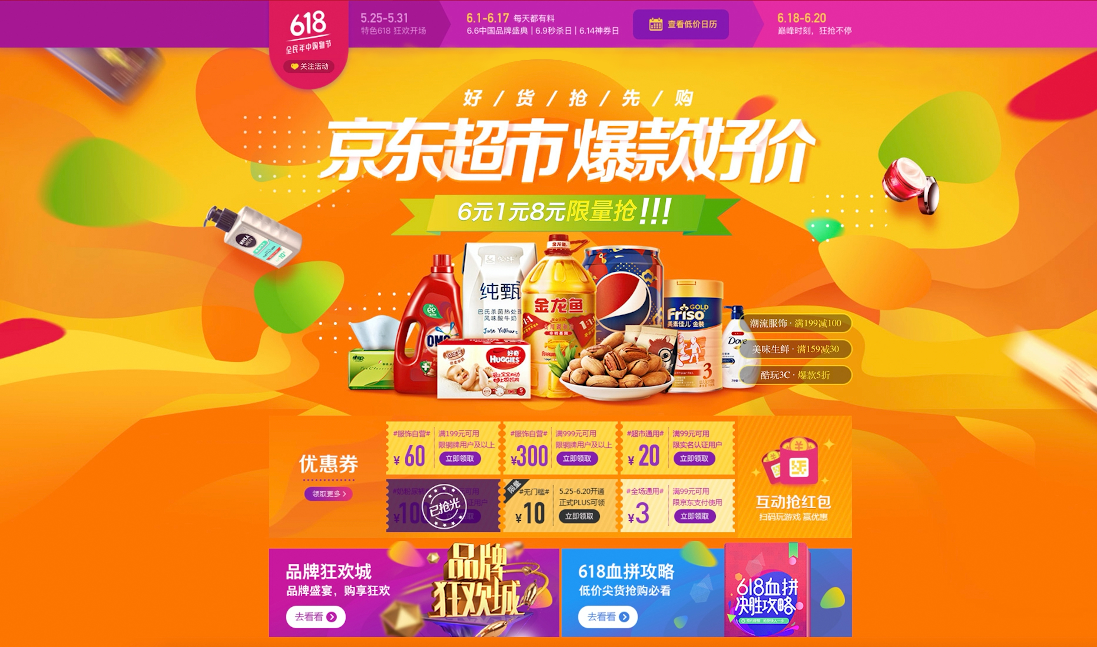 也就是說你的設計結果最終是要傳遞正確的定位信息和合適的氛圍給到目標用戶的,而設計的形式和創意也都應該圍繞著這個文案和活動目的來,比如剛過去的京東618某會場的頁面設計。