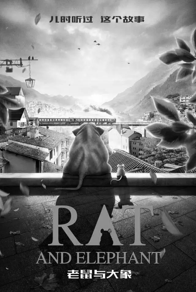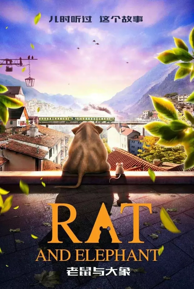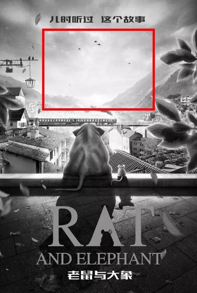 方案二:海報以突出主角和友情為主,那么可以將現有大象和老鼠放大至少一倍,整體下移,同樣要將遠方的房屋縮小繼續弱化處理,然后前景的葉子需要更通透一點更精致一點,即便是陽光比較強烈的逆光效果,葉子的邊緣也不該是現有的這樣哦,感覺自帶外發光了。