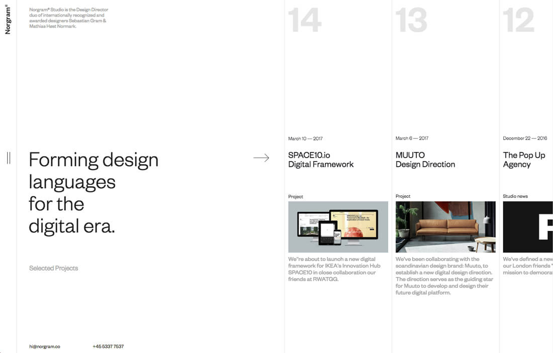 上方 Norgram 這個網站就使用了部分圖片作為視覺引導,向用戶暗示屏幕側面還有更多的內容可供瀏覽。視覺線索的存在,使得內容結構和滾動方向顯得統一而自然。
