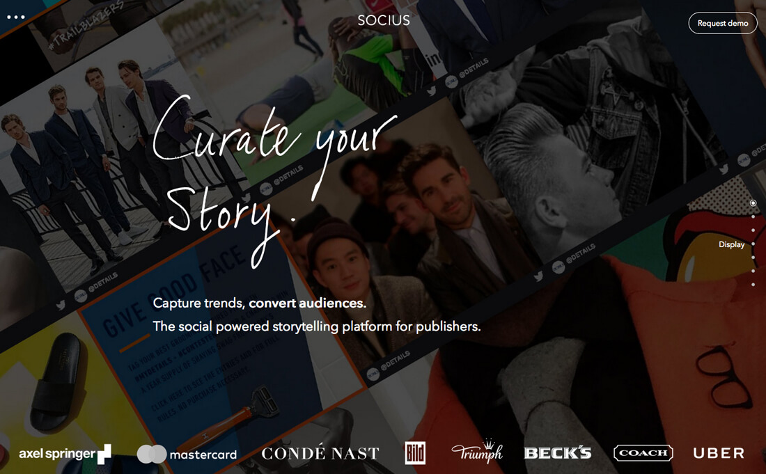 在上面的Socius 頁面的右側,使用了許多同類網站都采用的小圓點來作為視覺標識,當光標懸停在小圓點上的時候,會有信息浮現,告訴用戶這些區域的內容。同樣的,用戶可以通過點擊這些小圓點快速跳轉到特定的區域。