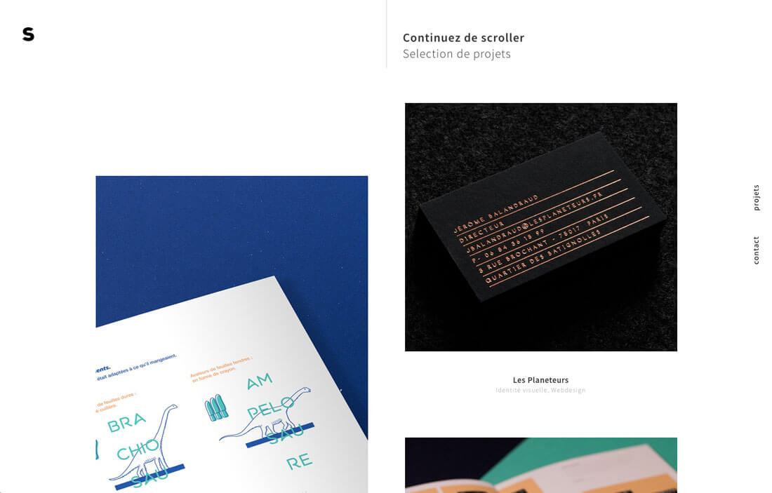 和側邊欄導航不同,這種完全旋轉90度到右側的文字導航,設計的更加微妙,通常出現在小型的作品展示型的網頁上。就像上方這個名為S的網站。