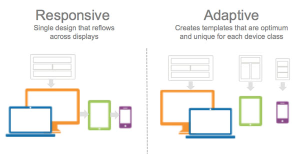 自適應設計是不太靈活的,只有工作在盡可能多的屏幕。如果一個新的屏幕大小的設備被釋放,您可能必須編輯您的設計或添加一個新的。響應的網站在工作中是足夠靈活的,但自適應網站將可能需要一些臨時維護。