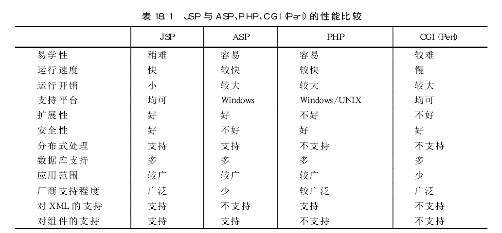 為簡明起見,下面將JSP與ASP.PHP、CGI(Perl)的性能作一歸納比較,如表所示。