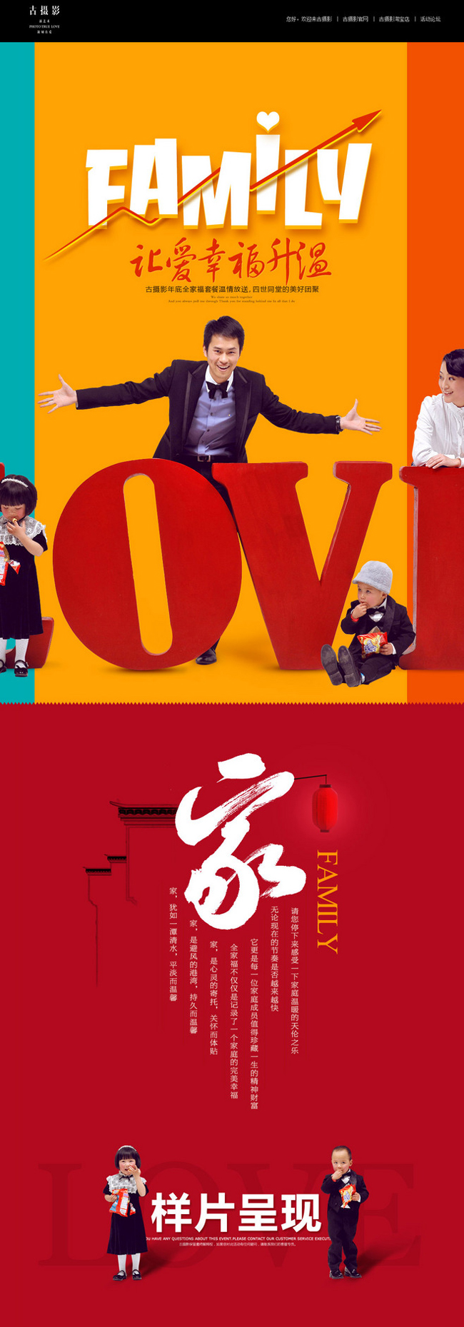 這個是以家為營銷點的攝影公司,采用的是流行的大字體網頁設計,色彩在第二屏采用的是中國喜慶的紅色。