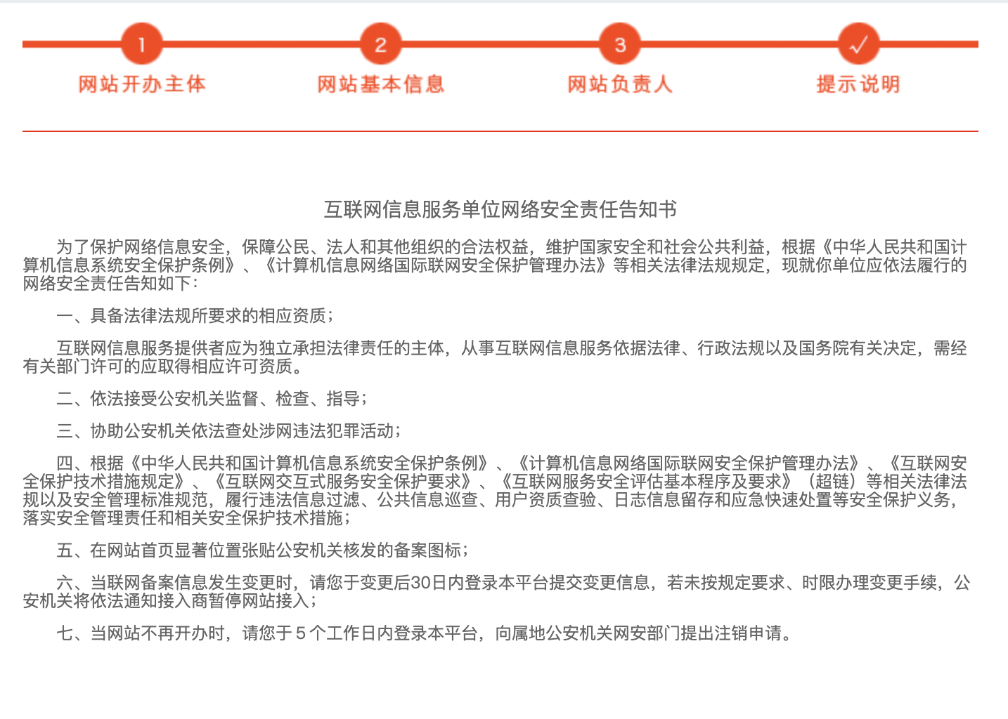 六、當聯網備案信息發生變更時,請您于變更后30日內登錄本平臺提交變更信息,若未按規定要求、時限辦理變更手續,公安機關將依法通知接入商暫停網站接入;