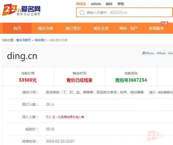 在當(dāng)晚的競價(jià)過程中,該域名經(jīng)過100多次出價(jià)角逐,最終以53,500元的價(jià)格結(jié)拍。