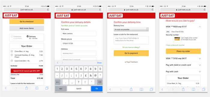 Just Eat的結賬分為多個頁面。我們還在設計中進一步簡化了支付頁面:用戶先選擇“現金支付”或“銀行卡支付”,然后才會轉到相關的頁面。可惜我們并沒有對這項優化進行測試。