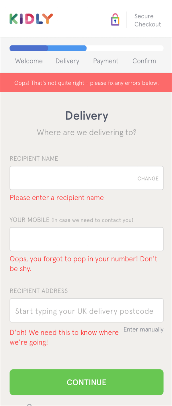 即使有多個錯誤,Kidly的地址填寫表單也很容易更正。