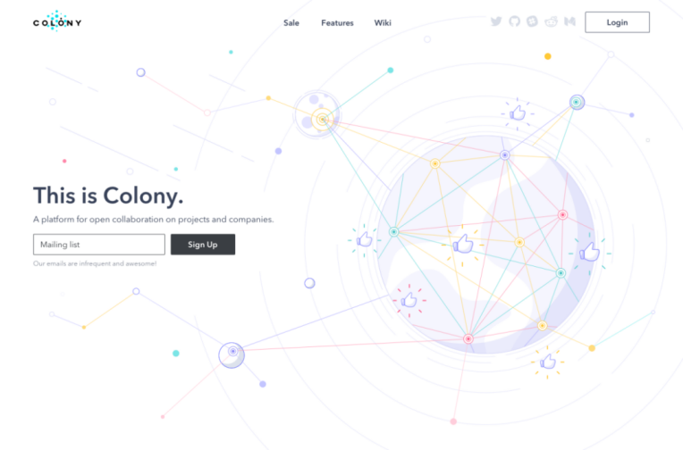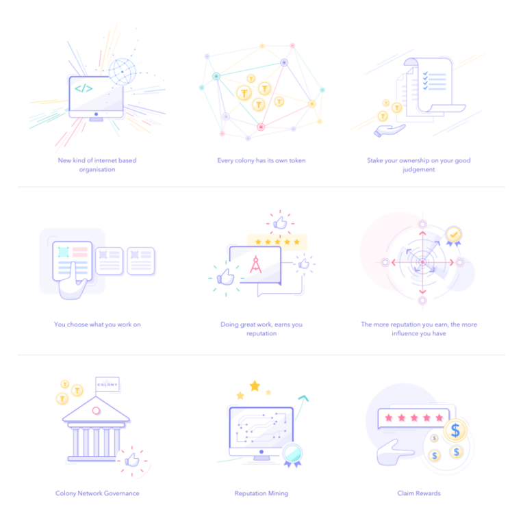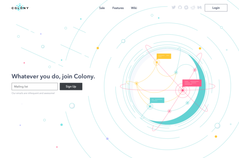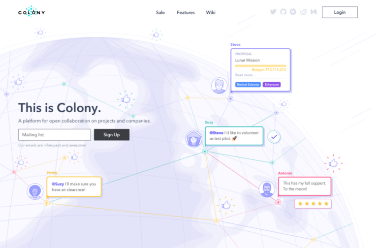設計師們拿出了不同風格的插畫,它們在主題上和整個UI保持一致,營造出友好、平易近人的氛圍,同時也讓人對整個公司形象產生足夠的好感。插畫中展示出 Colony 是如何幫助世界各地的用戶溝通、交流、達成目標的。