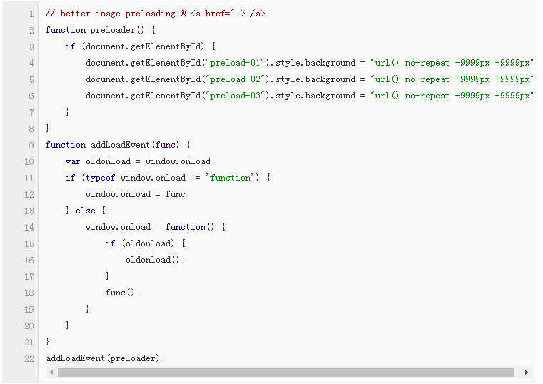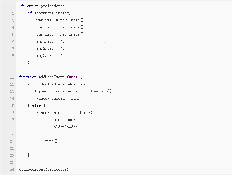 我們又對該方法進行了改進。將該腳本封裝入一個函數(shù)中,并使用 addLoadEvent(),延遲預(yù)加載時間,直到頁面加載完畢。