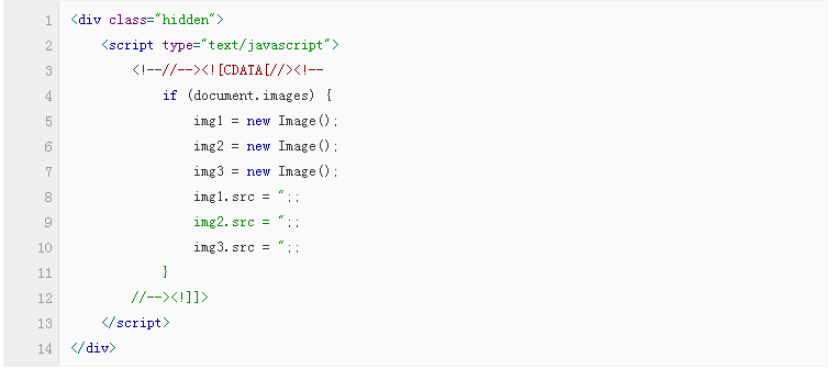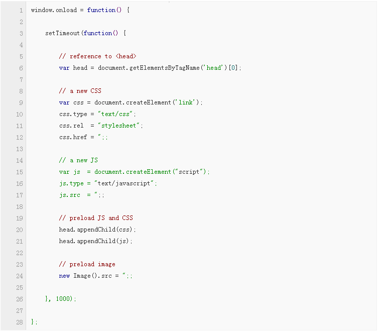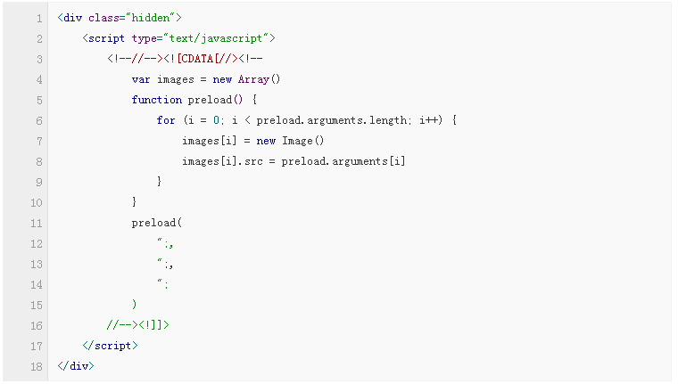 該方法雖然高效,但仍有改進余地。使用該法加載的圖片會同頁面的其他內(nèi)容一起加載,增加了頁面的整體加載時間。為了解決這個問題,我們增加了一些JavaScript代碼,來推遲預(yù)加載的時間,直到頁面加載完畢。代碼如下: