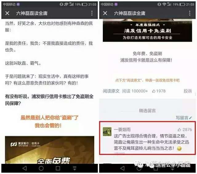 再例如,知名自媒體人六神磊磊讀金庸,堪稱貼片廣告界的翹楚,每條廣告都讓人猝不及防,以至于很多粉絲都是奔著廣告去看文章。