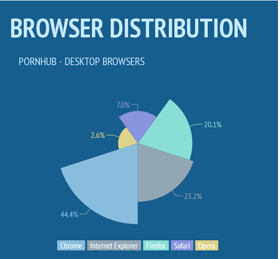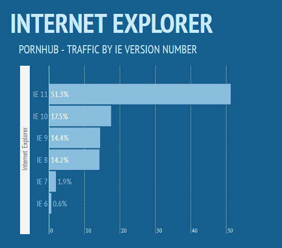 IE 的瀏覽數(shù)據(jù)特別被拉出,依版本號(hào)碼做出圖表,越新的版本占最多 IE11 是 51.3%,但古早的 IE6 和 IE7 仍分別占 IE 瀏覽比例有 0.6% 和 1.9%。雖然 IE5 已經(jīng)發(fā)布很久,但每天仍然有想要搜索色情片的人上來(lái) PornHub。