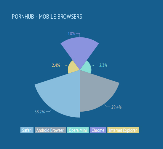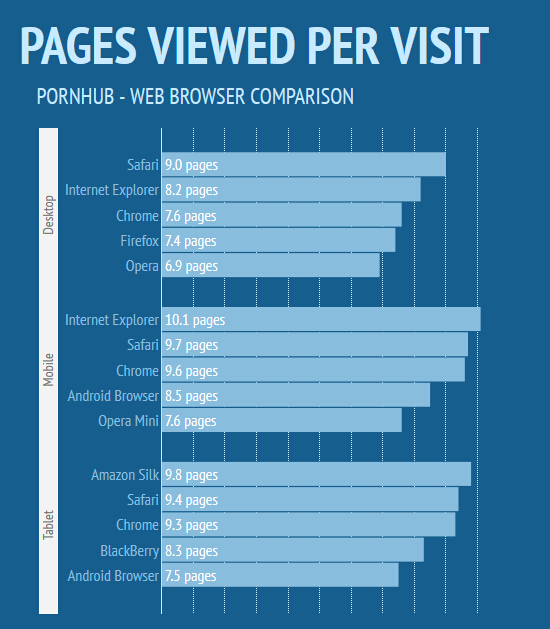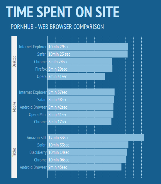 至于在 PornHub 的平均觀看時(shí)間,在桌面上,Apple 的 Safari 比起 IE 使用者,平均少大約 6 秒,各是 10 分 23 秒和 10 分 29 秒,F(xiàn)irefox 和 Chrome 則快兩分鐘,Opera 使用者,歌劇只能唱大約 7 分 31 秒。