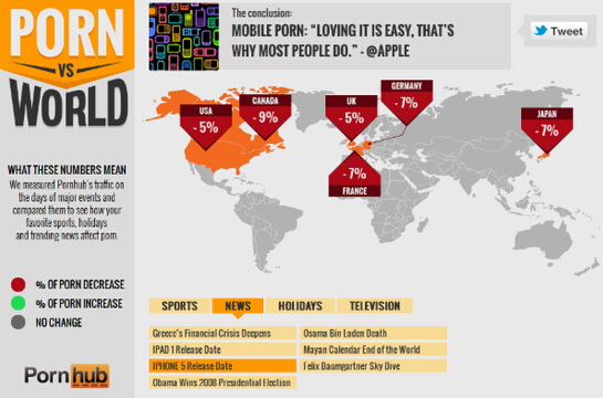 ▲ 在重大時(shí)節(jié),PornHub 流量受到影響,像是 iPhone 5發(fā)售日,來(lái)自加拿大的流量降了 7% 最多