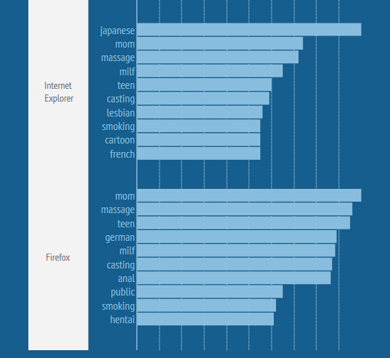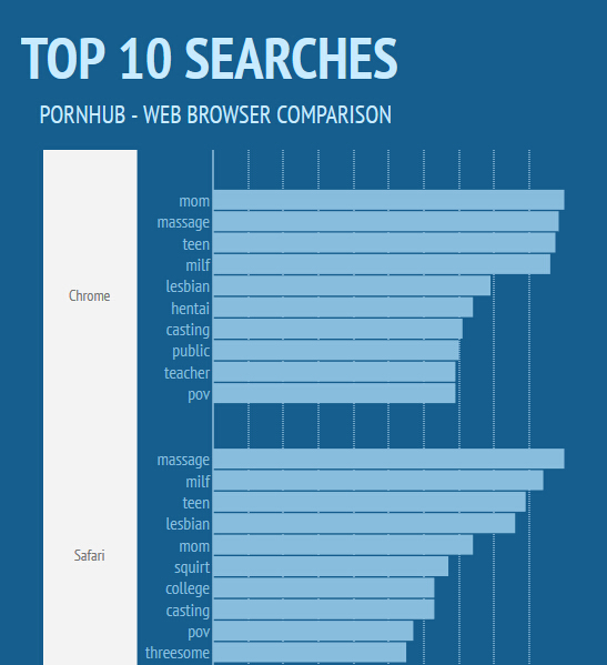 PornHub 上面,Chrome 和 FireFox 的用戶(hù)很愛(ài)搜索“mom”類(lèi)影片,而 Safari 用戶(hù)則愛(ài)找“massage”。其他搜索關(guān)鍵字有“teen”、“milf”、“casting”
