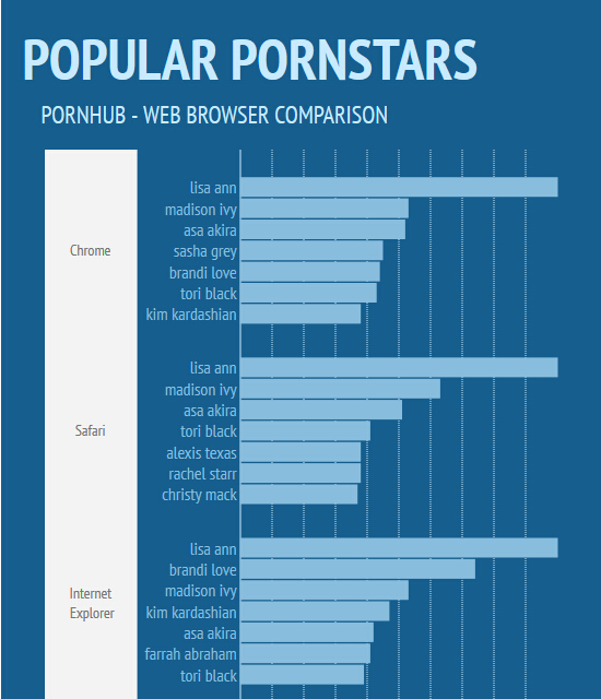 搜索量最多的色情片影星的是 莉薩.安 (Lisa Ann),她曾在色情片中演出議員莎拉·裴林。第二名是 麥迪遜·艾維 (Madison Ivy),不過(guò)在 IE 的結(jié)果就有點(diǎn)不一樣了,在 IE 上第二名是 布蘭迪.勒夫 (Brandi Love)。