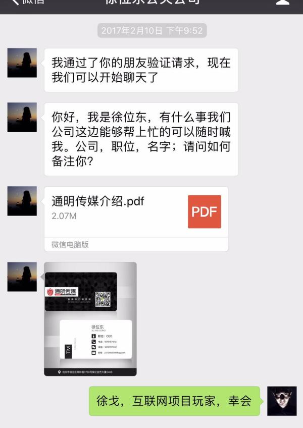 兩個陌生人在線下見面的時候,互相介紹環(huán)節(jié)往往有交換名片的環(huán)節(jié)。而在線上的話,細心點的加微信好友后會發(fā)個電子版的名片或者是一段自我介紹,如圖——