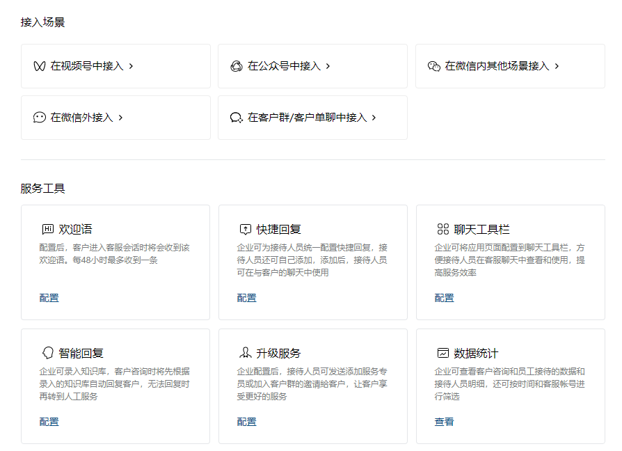 如上圖所示,有歡迎語(yǔ)、快捷回復(fù)、智能回復(fù),升級(jí)服務(wù)[即可以推薦企業(yè)微信成員給客戶微信,客戶點(diǎn)擊可添加企業(yè)成員企業(yè)微信]和數(shù)據(jù)統(tǒng)計(jì)