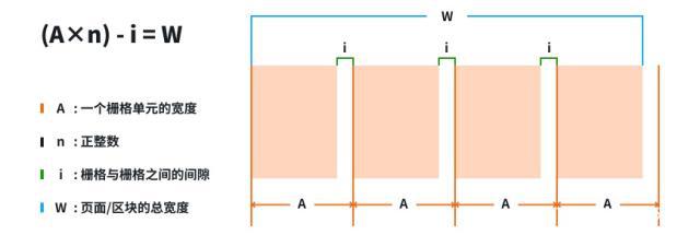 所以,我們真正創建的網頁內容區域,是小于1280或者1024地。而得出具體的內容區域尺寸的方法,是通過網頁的刪格系統計算出來的。網頁刪格系統是由平面網格系統衍生出來,針對網頁使用的排版系統。如果稍微看過這類文章的同學都會看見一個公式:(Axn)-i=W