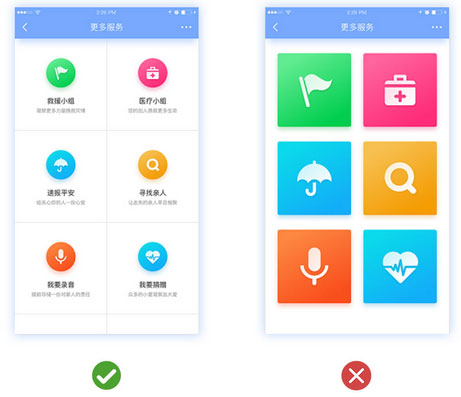 我們在進行網站制作時,如果在決定使用某一風格的圖標設計之后,在相同木塊下,請盡量使用同一的風格的圖標,如填充圖標的色彩飽和度;線性圖標的線條粗細;擬物風格的光線陰影等。成都網站制作 還發現很多人都喜歡純圖標式的設計,去掉文案試圖讓圖標看起來更高大上,但是往往忽略了圖標最重要的作用是提示用戶該按鈕的功能。舉個例子,如下圖所展示圖標,去掉文案之后很多圖標根本無法準確表達出確切的含義,這也是圖形的缺陷。我們在使用圖標時要盡量避免出現這種情況。