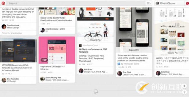 Infinite Scroll架構(gòu)也相對(duì)扁平,適合展示相同階層架構(gòu)的東西,而圖片就是最好的內(nèi)容物,因?yàn)橐曈X的信息比較文字更快被人所接收,我們總是能很掃射完圖片,Pinterest就是利用Infinite Scroll的特點(diǎn),不停給予各式圖片,供設(shè)計(jì)師快速找尋靈感、給予源源不絕的刺激。