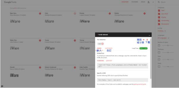 圖6. 點選黑色區(qū)塊,會跳出剛剛所選字體資訊,下方是直接嵌入網(wǎng)頁,也可以自己想要的格式。上方可以預覽分享或是馬上下載。