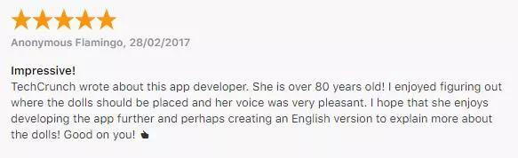 她已經(jīng)80多歲了!我覺(jué)得把娃娃放對(duì)位置很好玩,她的聲音也很好聽(tīng)。我希望她享受開(kāi)發(fā)應(yīng)用程序的樂(lè)趣,開(kāi)發(fā)更多的程序。我期待著英文版本的娃娃游戲。加油!