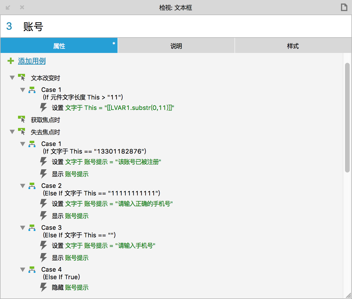 用例一:當賬號文本框文字=13301182876,提示文字內容為“該賬號已被注冊”,顯示賬號提示信息;