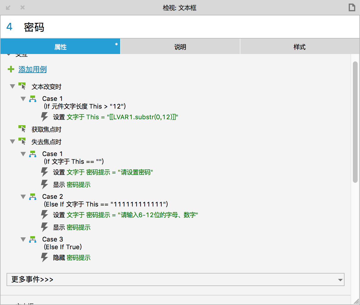 密碼:通過文本改變事件限制密碼輸入框只能輸入 12 位,即當密碼文本框中的文字長度大于 12 位時,則密碼文本框的值為=[[lvar1.substr(0,12)]],其中局部變量lvar1 為密碼文本框的文字。函數的用法與解釋請參照上文賬號輸入框的限制。